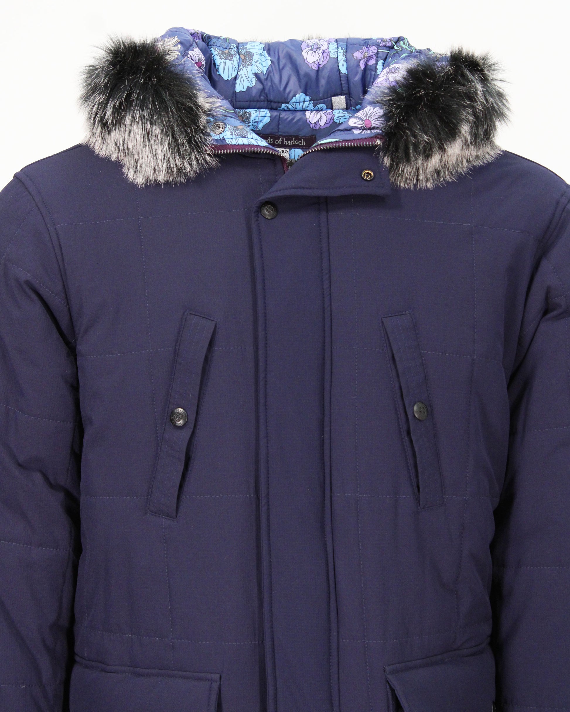 The Duffy Jacket is a refined cold-weather essential designed with a sleek length silhouette and crafted from durable ripstop stretch nylon for lightweight protection and ease of movement. The interior reveals a fully printed lining, an unexpected detail that brings a signature Lords of Harlech touch to a timeless outerwear piece.