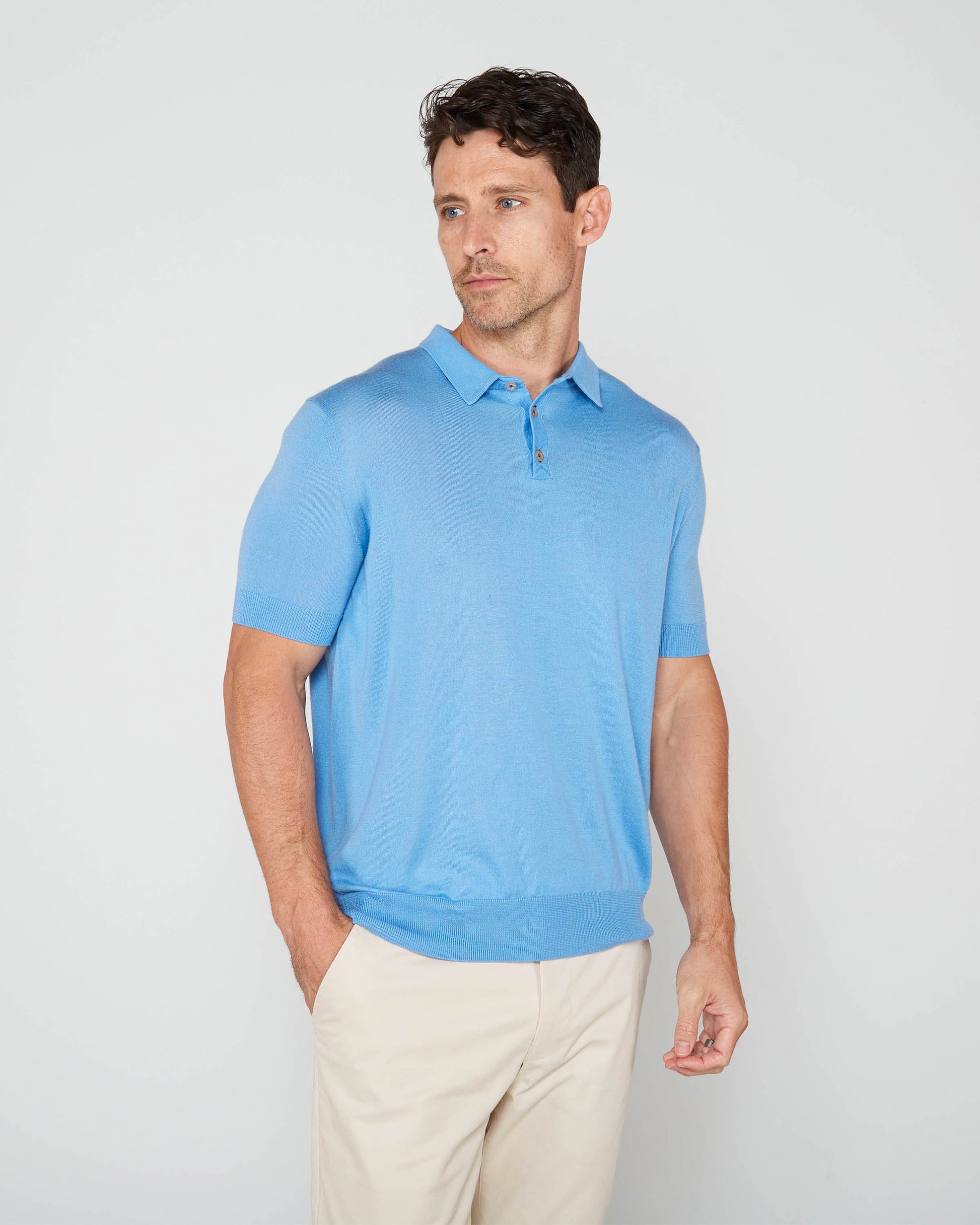 Our Pilgrim polo is made of 70% ultrafine merino, 20% silk, and 10% cashmere... which means it is extremely soft and lightweight! The fine yarns allow this sweater knit to breathe and stretch, giving you supreme comfort. Look closely and see the contrasting ribbed hem for an extra touch of love.