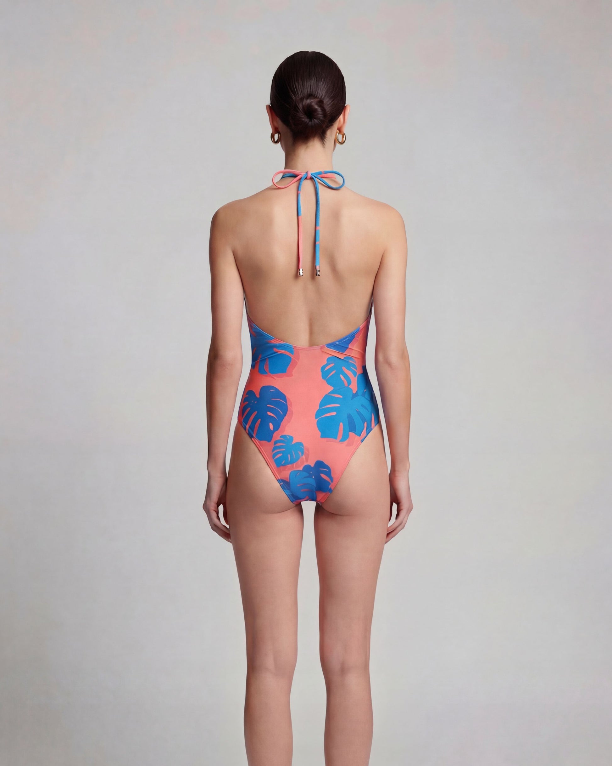 XENA MONSTERA FLORAL CORAL WOMENS HALTER ONE-PIECE SWIMSUIT
