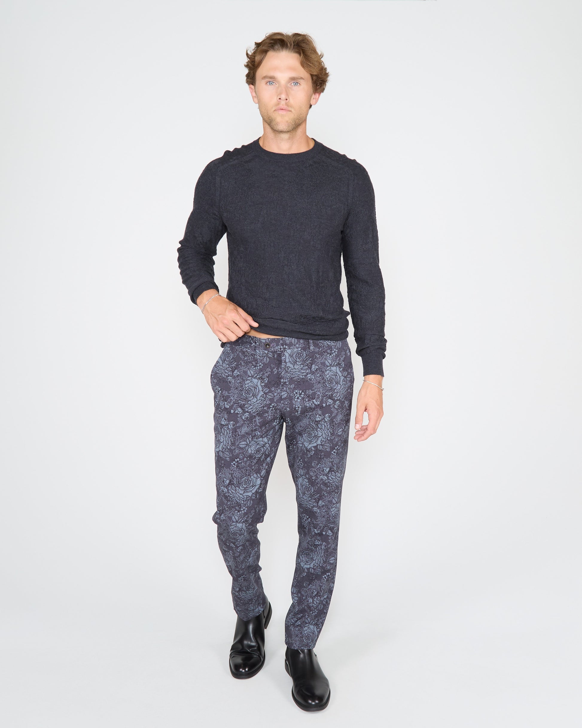 Step up your sweater game with this luxurious paisley crew neck. Crafted from a blend of superfine merino, silk, and cashmere, it boasts a saddle shoulder, ribbed details, and a signature polkadot stripe at the collar's back. Elevate your wardrobe with this elegant, textured piece.