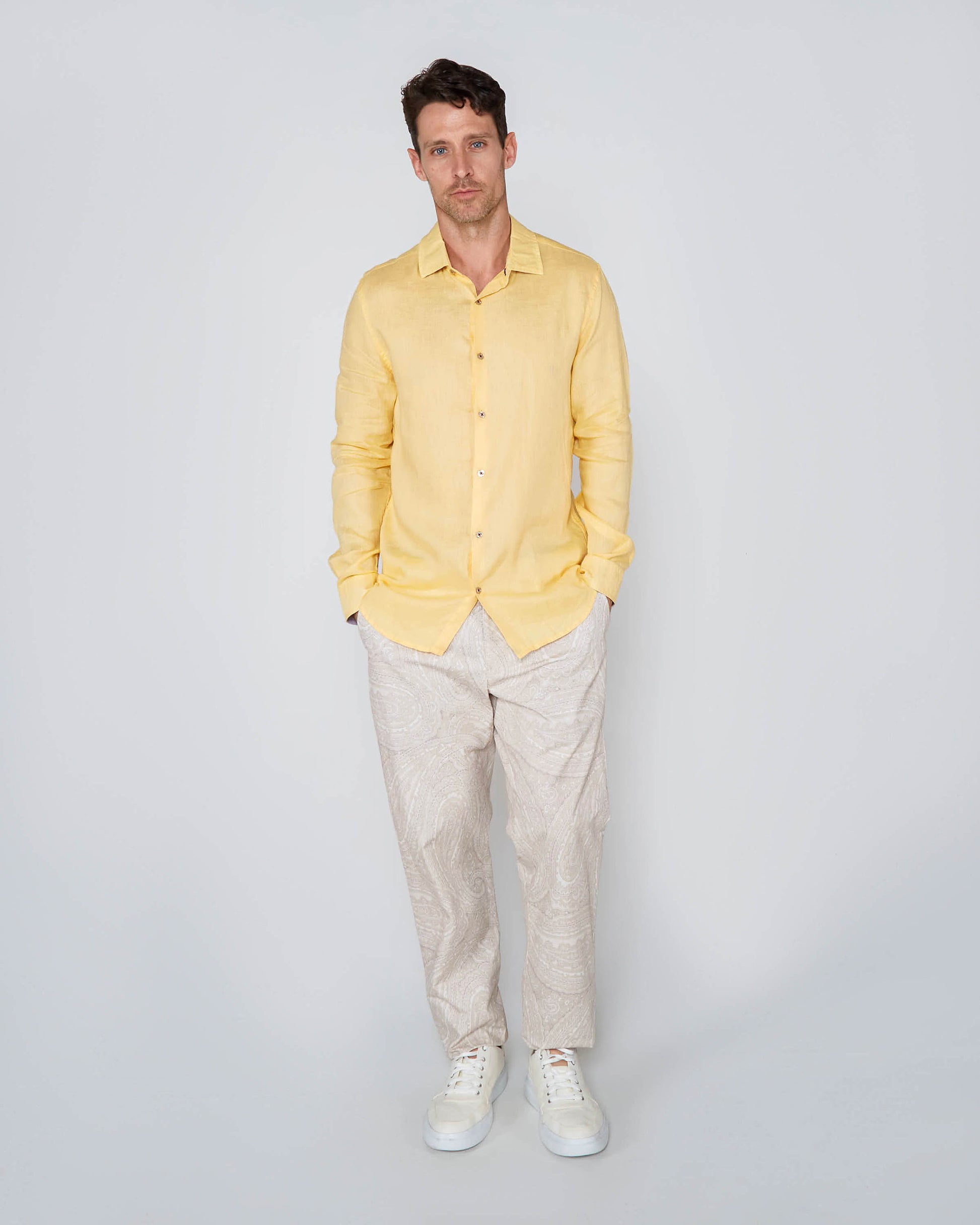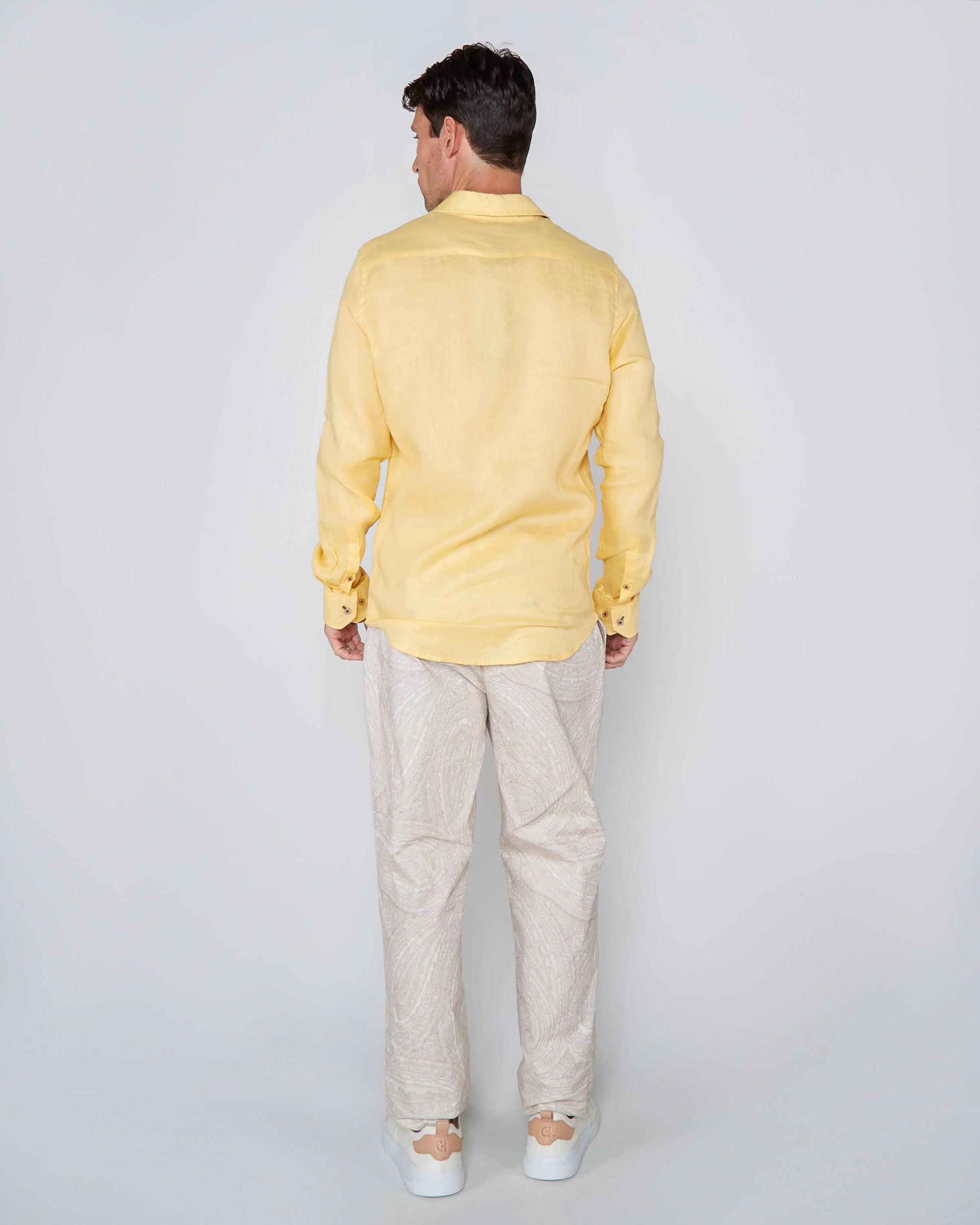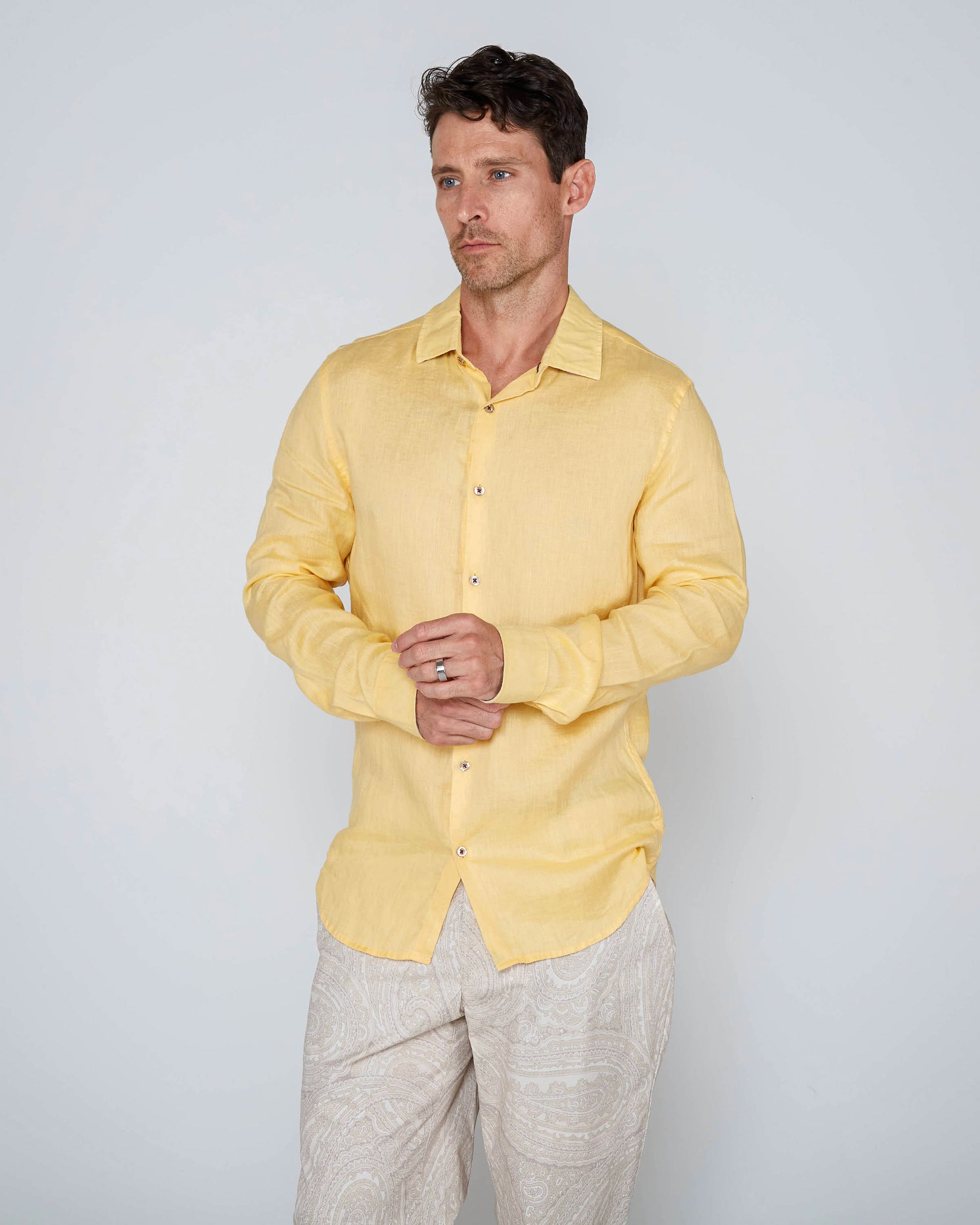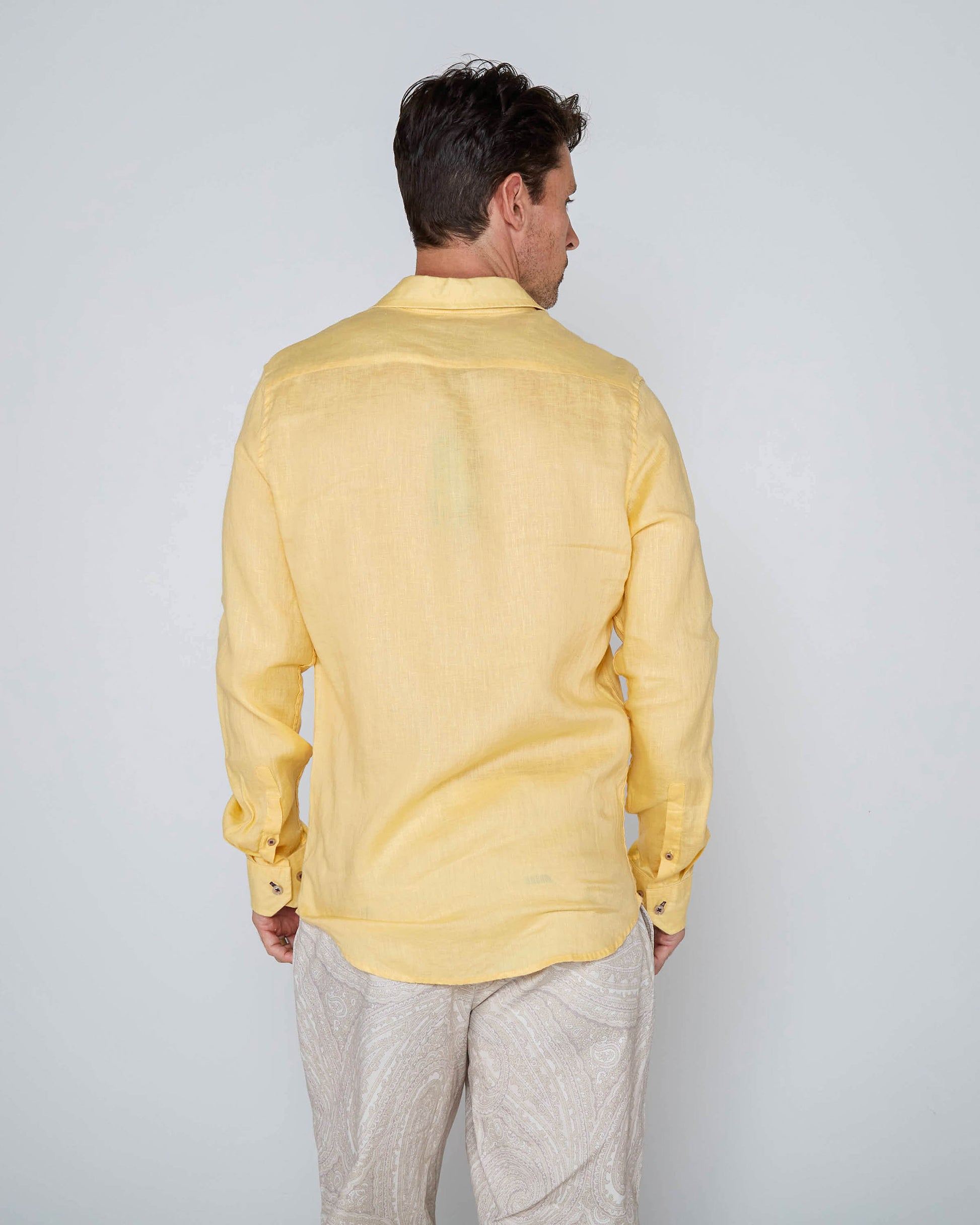 This long sleeve button-down shirt, made in Italy from 100% premium linen, exudes timeless elegance and exceptional craftsmanship. The lightweight, breathable linen fabric is perfect for keeping you cool and comfortable, even on warmer days. Its natural texture offers a relaxed yet refined look, while the durable fibers ensure a long-lasting garment. With a classic button-down design and a tailored fit, this shirt provides a sophisticated silhouette that's versatile enough for both casual and smart-casual occasions. Whether layered or worn on its own, this Italian-made linen shirt is a luxurious addition to any wardrobe.