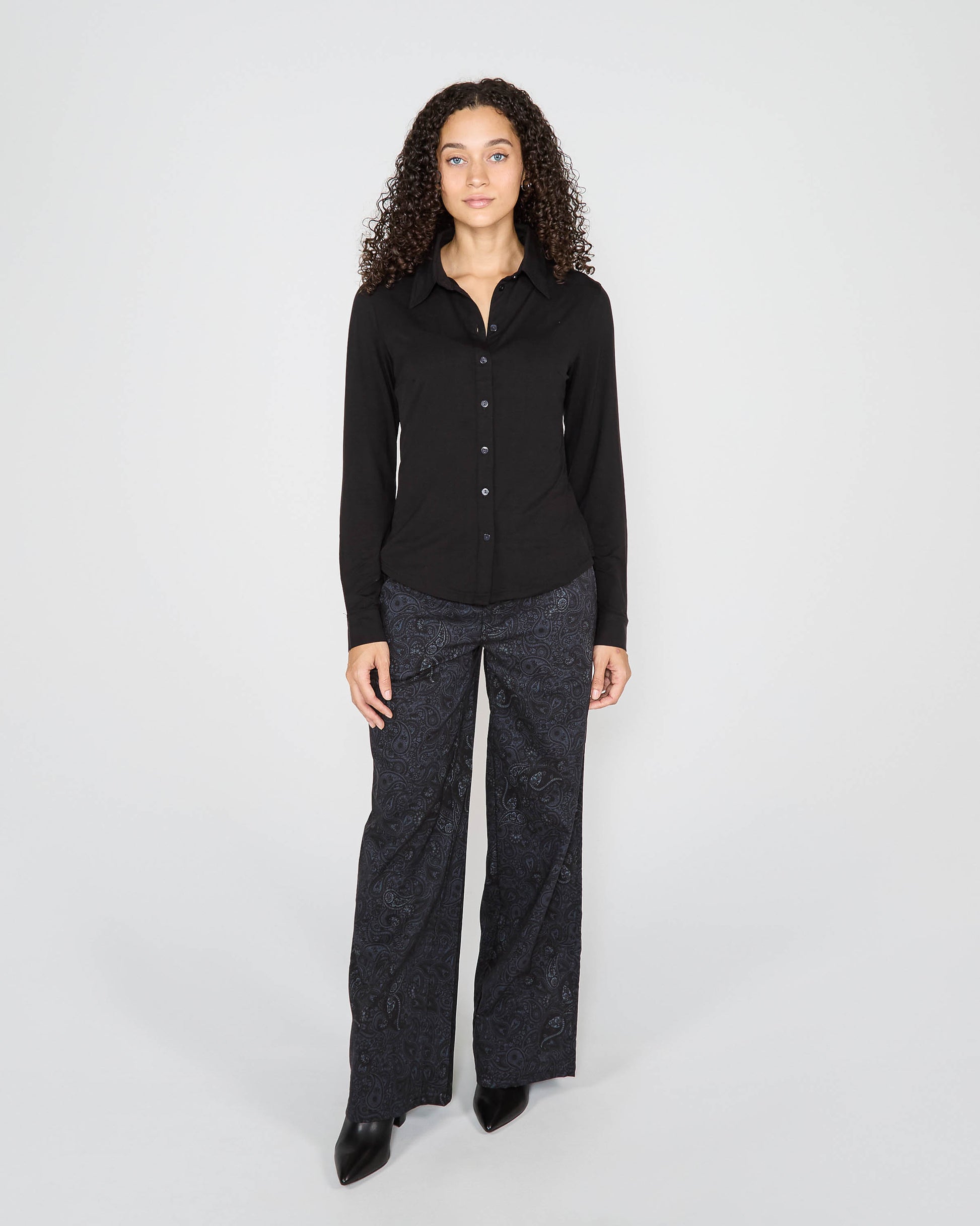 A classic silhouette, reimagined in a luxuriously soft knit. Designed with a relaxed yet polished look, it features a button front and fluid drape that moves with you. Dress it up for the office, layer it under a blazer, or wear it untucked for a laid-back feel. This shirt brings effortless versatility to any wardrobe.
